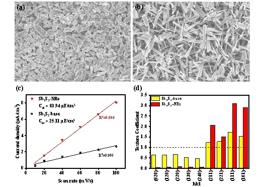 圖2(a)Sb2S3 base和(b)Sb2S3 NRs的SEM圖;(c)雙電層電容測(cè)試圖和(d)晶格紋理系數(shù)圖