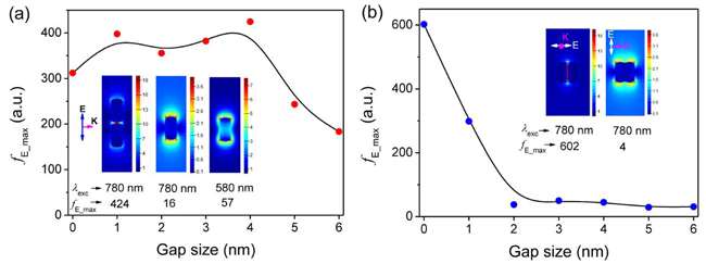 (a) 端對端排列納米棒二聚體的電場增強因子(f???)隨間隙變化,插圖為1 nm間隙的電場分布。
