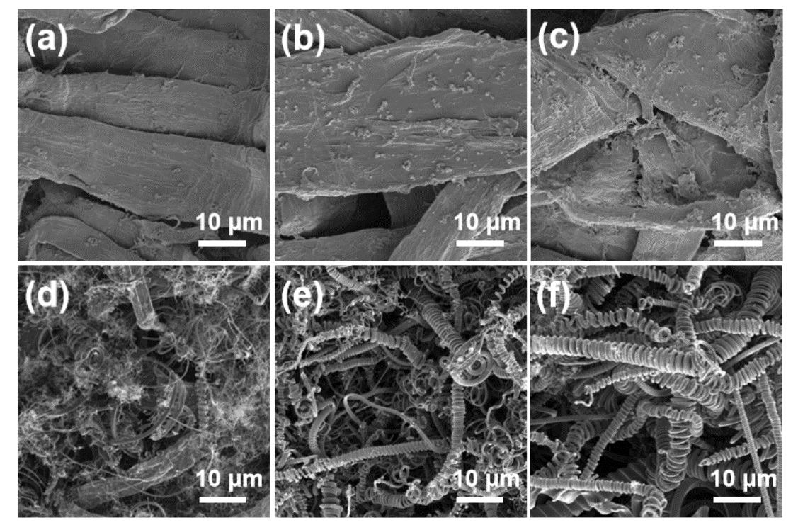 圖2顯示了噴涂到CTP上的Ni納米催化劑的SEM圖像。CTP纖維呈扁平的線性形狀,寬度約為15.0μm。鎳納米粒子均勻地涂覆在CTP上。隨著噴涂次數(shù)的增加,鎳催化劑的負載量顯著增加。CMC呈現(xiàn)螺旋結(jié)構(gòu),大量CMC在CTP基材上合成。