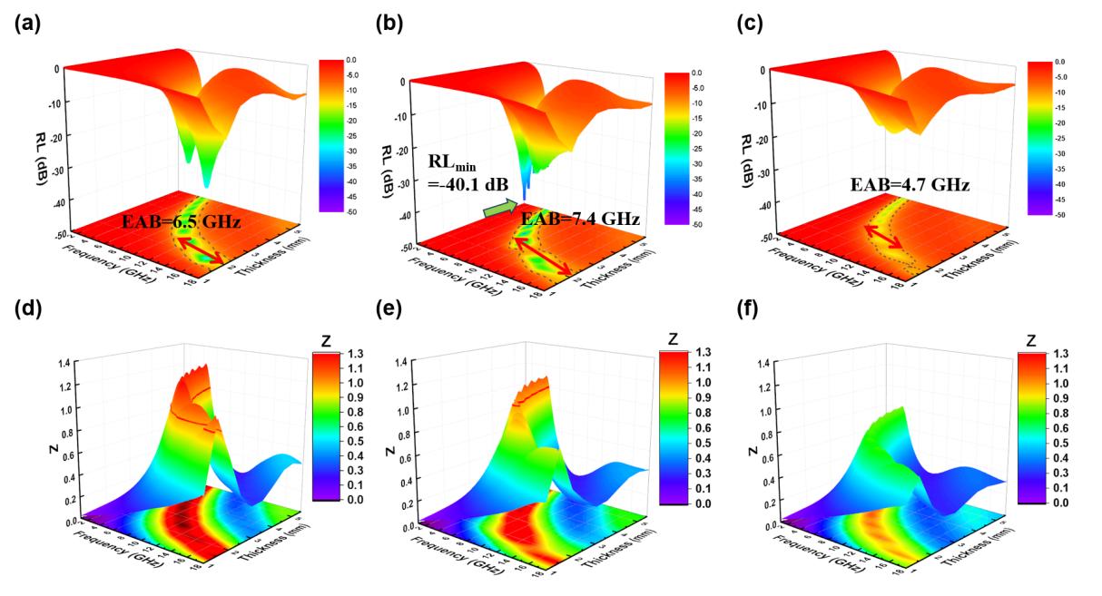 圖5顯示了CTP/CMC的RL曲線。圖5a顯示CTP/CMC-5的MA性能較差。在5.9 GHz和5.5 mm厚度下,RLmin值為-17.4 dB。從圖5b可以看出,CTP/CMC-10表現(xiàn)出優(yōu)異的MA性能,RLmin為-40.1 dB(7.6 GHz,3.5 mm),EAB為7.4 GHz(10.6-18.0 GHz,2.2 mm)。此外,如圖5c所示,CTP/CMC-20表現(xiàn)出良好的MA性能,EAB為6.5 GHz(11.5-18.0 GHz,2.2mm)。圖5d-f顯示了CTP/CMC的阻抗匹配。圖5d顯示CTP/CMC-5樣品的Z峰約為1.3,表明阻抗不匹配。如圖5e所示,CTP/CMC-10的Z峰約為1.0(紅線),表現(xiàn)出良好的阻抗匹配。這表明CMC的生長調(diào)節(jié)了CTP/CMC的阻抗,促進了其MA性能。如圖5f所示,CTP/CMC-20的Z峰為0.8,阻抗匹配度不如CTP/CMC-10,這與MA性能是一致的。