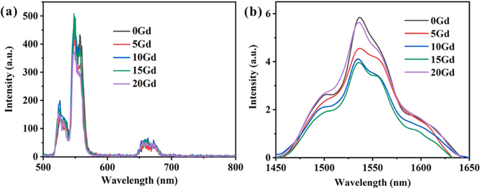 圖1. Er3+摻雜釓碲酸鹽近紅外閃爍玻璃的X射線激發(fā)發(fā)光(XEL)光譜:(a) 500-800 nm波段,(b) 1450-1650 nm波段。