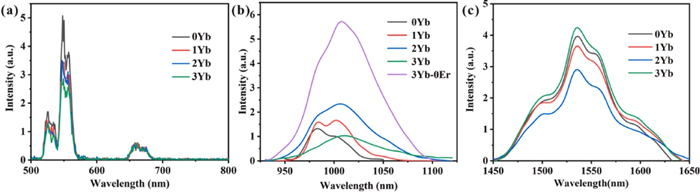 圖2. Yb3+/Er3+共摻雜釓碲酸鹽近紅外閃爍玻璃的X射線激發(fā)發(fā)光(XEL)光譜:(a) 500-800 nm波段,(b) 925-1125 nm波段,(c) 1450-1650 nm波段。