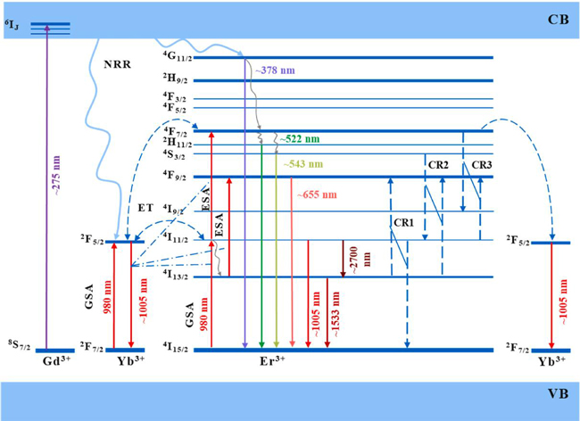 圖3. Yb3+/Er3+摻雜釓碲酸鹽近紅外閃爍玻璃的能級示意圖