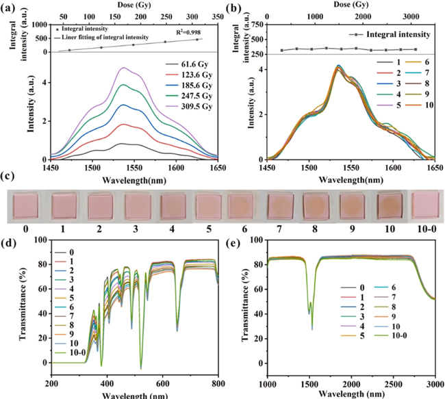 圖4. 20Gd樣品在不同X射線劑量下的XEL光譜(a)和(b),樣品實物照片(c);重復X射線輻照后的透射光譜(d)和(e)。
