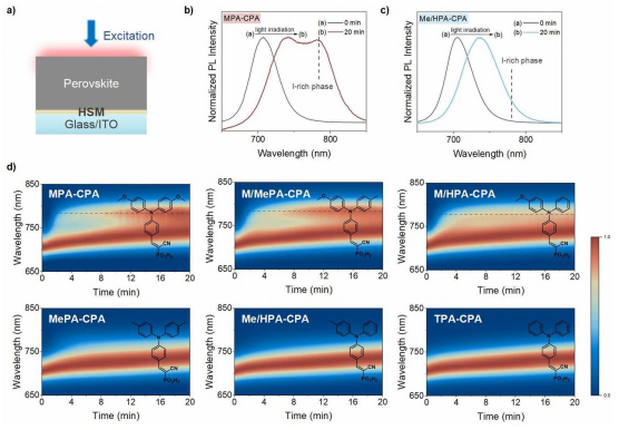 圖1 (a)光致發(fā)光(PL)實驗示意圖。(b)在MPA-CPA和(c)在Me/HPA-CPA上沉積的1.76 eV鈣鈦礦在光照射20分鐘后的光致發(fā)光光譜。(d)利用MPA-CPA、M/MePA-CPA、M/HPA-CPA、MePA-CPA、Me/HPA-CPA和TPA-CPA作為HSMs,跟蹤1.76 eV鈣鈦礦在20分鐘內(nèi)的光致發(fā)光光譜變化。比例尺表示鈣鈦礦薄膜的歸一化光致發(fā)光強(qiáng)度,虛線表示碘富相的出現(xiàn)。