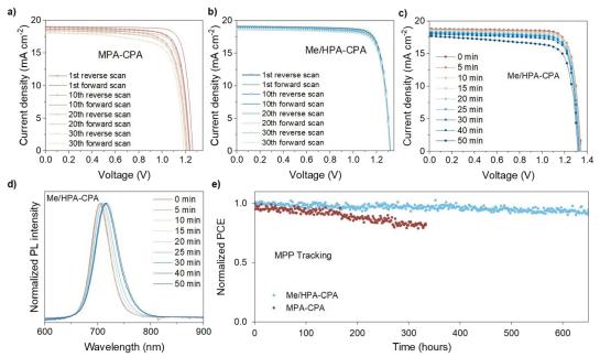 圖3 (a)和(b)基于MPA-CPA和Me/HPA-CPA的器件在0.10 V s-1掃描速率下30次正反掃描周期的J–V曲線。(c)在光照條件下(氙燈,1個太陽),基于Me/HPA-CPA的器件在50分鐘內(nèi)J–V曲線和(d)PL光譜的變化。(e)在氮氣條件下,基于MPA-CPA和Me/HPA-CPA的寬禁帶鈣鈦礦太陽能電池(WBG-PSCs)的操作穩(wěn)定性。其中,基于MPA-CPA和Me/HPA-CPA的WBG-PSCs的初始PCE分別為18.9%和20.3%。