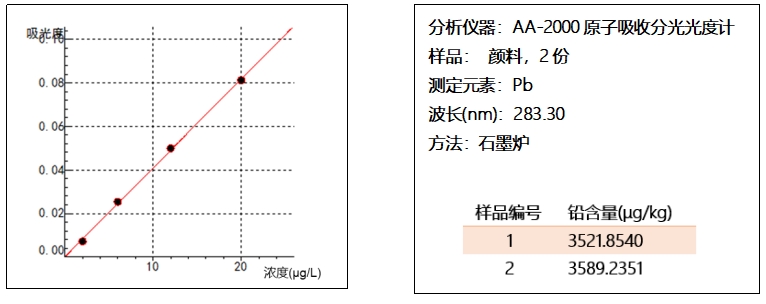 食品添加劑是指為改善食品品質(zhì)和色、香、味,以及為防腐、保鮮和加工工藝的需要而加入食品中的人工合成或者天然物質(zhì)。食品用香料、膠基糖果中基礎(chǔ)劑物質(zhì)、食品工業(yè)用加工助劑、營養(yǎng)強化劑也包括在內(nèi)?!妒称钒踩珖覙?biāo)準(zhǔn) 食品添加劑使用標(biāo)準(zhǔn)》(GB 2760-2024)中對食品添加劑*基本的要求是不應(yīng)對人體產(chǎn)生任何健康危害。此次天水幼兒園血鉛事件中違規(guī)使用顏料作為食品添加劑,那么在一般的顏料中鉛含量究竟是什么水平呢?圖1為卓立漢光AA-2000原子吸收分光光度計測定顏料鉛含量的示例,兩份樣品測出來的Pb含量高達3521.8540μg/kg和3589.2351 μg/kg。可見顏料是絕對禁止作為食品添加劑使用的。
