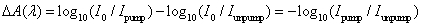 瞬態(tài)吸收測試的是材料被激發(fā)后吸收相對于穩(wěn)態(tài)的瞬時變化。根據(jù)比爾-朗伯(Beer-Lambert)定律,一束光穿過均勻吸收介質(zhì)會發(fā)生強度的衰減。以溶液樣品為例,對于波長為λ的光,忽略散射作用,其透過樣品的光強正比于光程L,液體樣品的濃度c,以及其摩爾吸收系數(shù)e,其吸收度(Absorbance)表達為: (1)