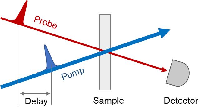 類似于大部分超快光譜技術(shù),通常意義上的瞬態(tài)吸收是基于泵浦-探測(Pump-Probe)機制構(gòu)建的技術(shù),如圖1所示。其中泵浦光為一束強脈沖激光,用于激發(fā)被測試材料;探測光為一束較弱的脈沖激光(通常功率密度小于泵浦光兩個量級以上),用于探測材料被泵浦光瞬時激發(fā)之后的吸收度的變化。瞬態(tài)吸收光譜信號由有泵浦光與無泵浦光激發(fā)時探測光透過材料的吸收度相減獲得,即: (2)