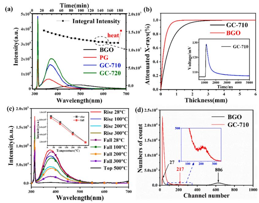 圖 3. 納米玻璃閃爍體的閃爍特性。(a)樣品與 BGO 的 X 射線激發(fā)發(fā)光(XEL)光譜,虛線顯示積分 XEL 強(qiáng)度隨輻照時(shí)間(長(zhǎng)達(dá) 176 分鐘)的變化;(b)計(jì)算得到的 GC-710 與 BGO 在 50 keV X 射線下的衰減效率隨樣品厚度的變化,插圖為 GC-710 的放射發(fā)光(RL)衰減曲線及雙指數(shù)擬合(藍(lán)色曲線);(c)GC 在 28–500℃升 - 降溫循環(huán)中的 XEL 光譜,插圖為升 - 降溫過(guò)程中 XEL 強(qiáng)度的變化;(d)GC-710 與 BGO 的 137Cs γ 射線脈沖高度譜,插圖為 GC-710 的局部放大圖。