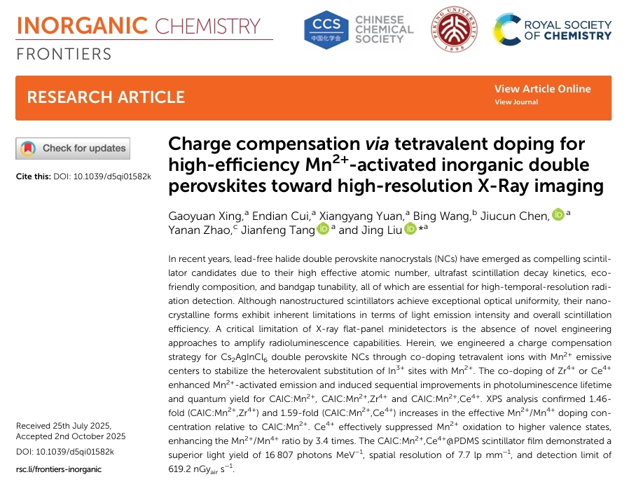 西南大學(xué)材料與能源學(xué)院劉婧團隊在X射線成像領(lǐng)域取得重要進展。研究成果以“Charge compensation via tetravalent doping for high-efficiency Mn2+-activated inorganic double perovskites toward high-resolution X-Ray imaging”為題發(fā)表在國際知名期刊《Inorganic Chemistry Frontiers》上。西南大學(xué)為該論文第一單位,劉婧副教授為論文通訊作者。今天小卓為大家分享該研究成果,希望對您的科學(xué)研究或工業(yè)應(yīng)用帶來一些靈感和啟發(fā)。