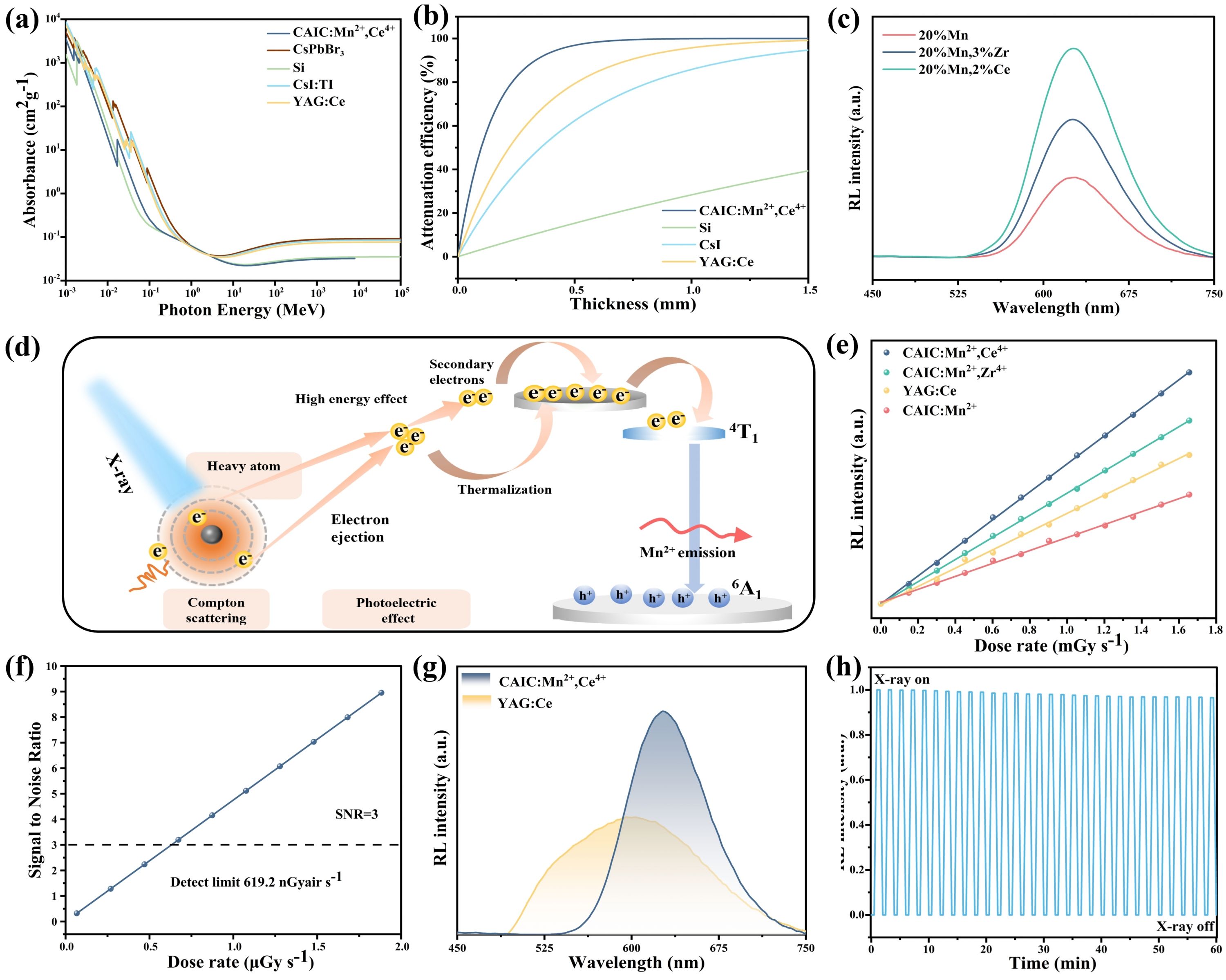 圖2(a)CsPbBr3、Si、CsI-TI、YAG:Ce和CAIC:Mn2+, Ce4+對光子能量的線性衰減系數(shù);(b)幾種閃爍體在X射線輻射下的衰減效率與厚度的函數(shù)關(guān)系;(c)CAIC:Mn2+、CAIC:Mn2+, Zr4+與CAIC:Mn2+, Ce4+的輻射發(fā)光光譜;(d)提出的輻射發(fā)光機理圖;(e)CAIC:Mn2+、CAIC:Mn2+, Zr4+、CAIC:Mn2+, Ce4+與YAG:Ce閃爍體的輻射發(fā)光強度隨X射線劑量率的變化;(f) CAIC:Mn2+, Ce4+的X射線劑量率的變化與信噪比SNR的函數(shù)關(guān)系;(g)CAIC:Mn2+, Ce4+與YAG:Ce閃爍體的輻射發(fā)光光譜;(h)連續(xù)30次X射線照射-關(guān)閉循環(huán)下CAIC:Mn2+, Ce4+的輻射發(fā)光強度變化。