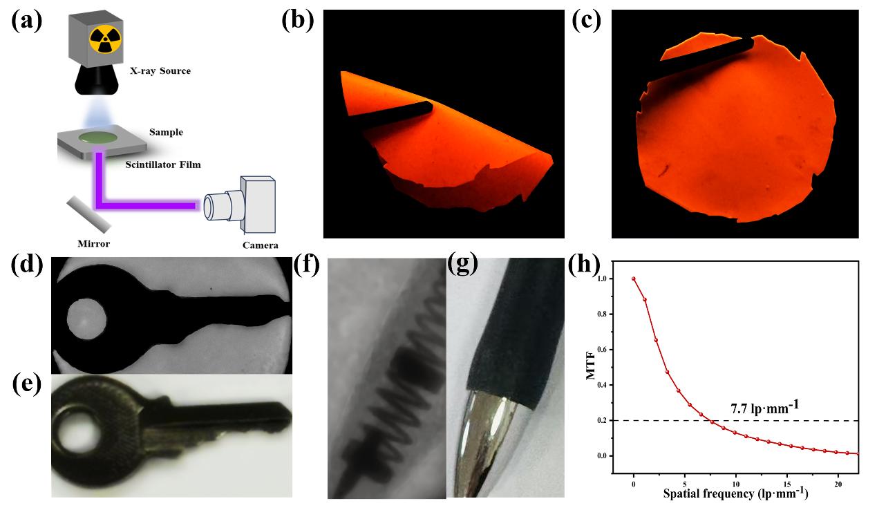 圖3 (a)X射線成像系統(tǒng)示意圖;(b,c)CAIC:Mn2+, Ce4+@PDMS薄膜在紫外燈(290 nm)下的薄膜發(fā)光圖片;(d,e)金屬鑰匙在日光下照片和X射線成像照片;(f,g)圓珠筆在日光下照片和X射線成像照片;(h)通過斜邊法測量CAIC:Mn2+, Ce4+@PDMS薄膜薄膜的MTF曲線。