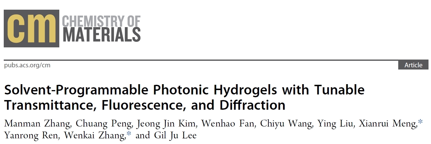 近日,河南大學(xué)張文凱教授與釜山國(guó)立大學(xué)Gil Ju Lee副教授團(tuán)隊(duì)合作,在可編程水凝膠摻雜多色碳點(diǎn)領(lǐng)域研究中取得重要進(jìn)展,相關(guān)成果以“Solvent-Programmable Photonic Hydrogels with Tunable Transmittance, Fluorescence, and Diffraction”為題發(fā)表在國(guó)際知名期刊《Chemistry of Materials》上。
