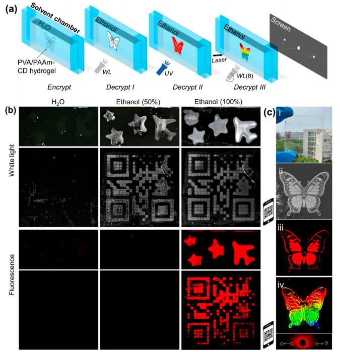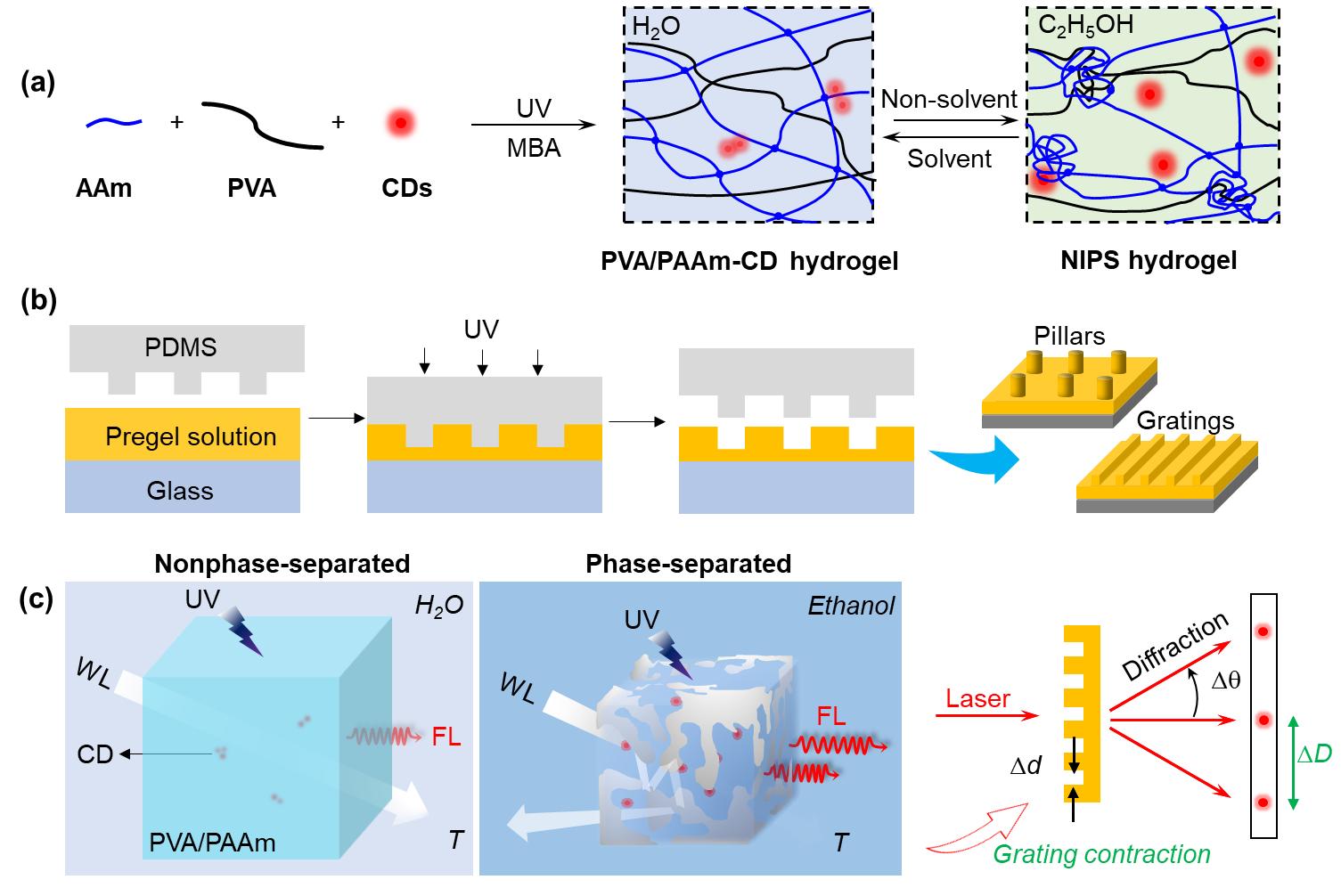 本研究成功開(kāi)發(fā)了一種基于非溶劑誘導(dǎo)相分離(NIPS)機(jī)制的溶劑可編程光子水凝膠,該體系通過(guò)單一刺激信號(hào)同步實(shí)現(xiàn)了透射、熒光與衍射的三模態(tài)可逆光學(xué)調(diào)控,為多模態(tài)防偽與可編程光子器件提供了新材料平臺(tái)。該水凝膠由摻雜紅色熒光碳點(diǎn)(CDs)的聚乙烯醇/聚丙烯酰胺(PVA/PAAm)互穿網(wǎng)絡(luò)構(gòu)成,其中碳點(diǎn)兼具光引發(fā)劑與熒光發(fā)射體的雙重功能。當(dāng)暴露于乙醇/水混合物時(shí),滲透壓失衡觸發(fā)水凝膠發(fā)生微觀相分離,形成折射率各異的聚合物富集域與貧乏域。這一結(jié)構(gòu)重構(gòu)直接引發(fā)三種協(xié)同的光學(xué)響應(yīng):首先,微米級(jí)的結(jié)構(gòu)異質(zhì)性導(dǎo)致強(qiáng)烈的米氏散射,使可見(jiàn)光透射率從>60%急劇下降至<2%,材料由透明轉(zhuǎn)變?yōu)椴煌该?;其次,熒光?qiáng)度在相分離態(tài)下獲得超過(guò)26倍的顯著增強(qiáng),其機(jī)理歸因于乙醇環(huán)境對(duì)碳點(diǎn)非輻射躍變的極性抑制,以及相分離域?qū)ぐl(fā)光產(chǎn)生的散射約束效應(yīng)共同作用;再者,通過(guò)軟光刻技術(shù)在凝膠表面集成的微光柵結(jié)構(gòu),會(huì)因溶劑交換引發(fā)的體積收縮而改變其周期常數(shù),進(jìn)而實(shí)現(xiàn)衍射角的動(dòng)態(tài)調(diào)控。值得強(qiáng)調(diào)的是,這三種光學(xué)模態(tài)的切換完全可逆,且均受控于同一NIPS物理過(guò)程,確保了響應(yīng)的一致性與可靠性。