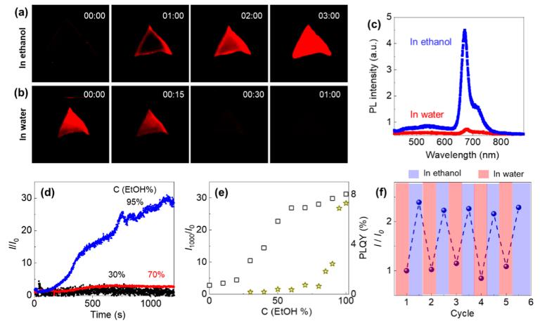 圖4 乙醇誘導(dǎo)相分離對(duì)PVA/PAAm-CD水凝膠熒光的調(diào)控:(a,b) 熒光照片顯示乙醇中增強(qiáng)與水中的恢復(fù);(c) 相分離態(tài)熒光光譜顯著增強(qiáng);(d) 不同濃度乙醇中的熒光強(qiáng)度時(shí)程曲線;(e) 熒光增強(qiáng)比與溶劑極性/PLQY的關(guān)聯(lián);(f) 五次循環(huán)驗(yàn)證熒光開(kāi)關(guān)的可逆性。