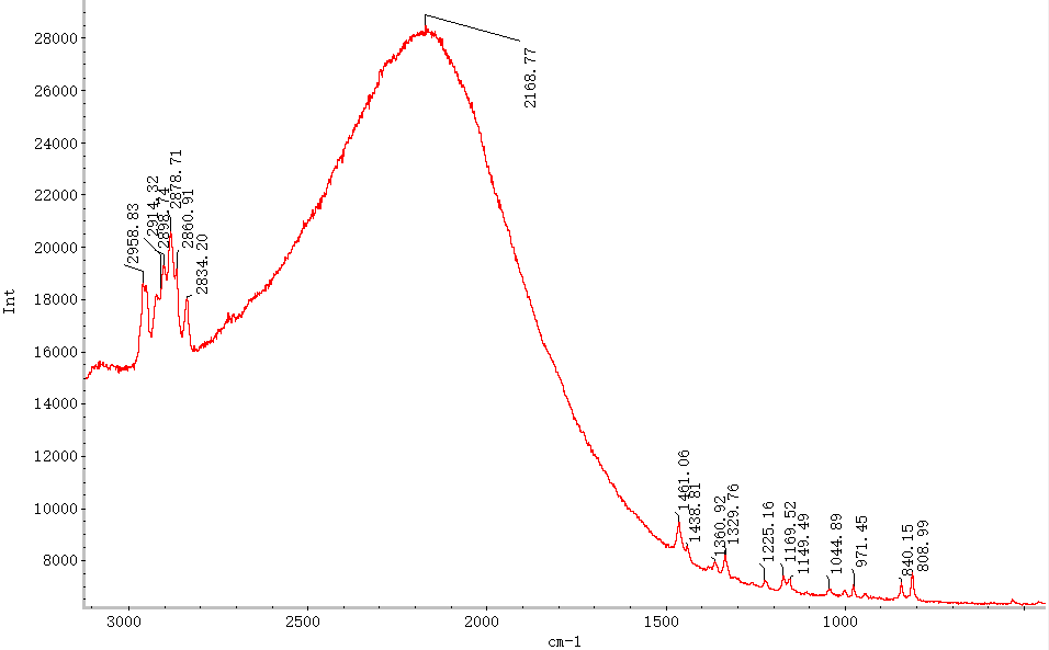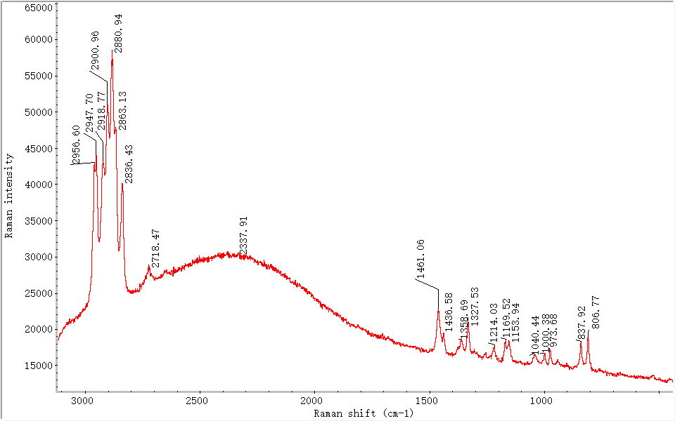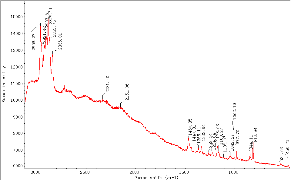 聚丙烯有2954cm-1、2923cm-1、2903cm-1、2885cm-1、2841cm-1、2723cm-1、1459cm-1、1438cm-1、1360cm-1、1330cm-1、1167cm-1、1167cm-1、1147cm-1、973cm-1、842cm-1、810cm-1、529cm-1、456cm-1、399cm-1的特征振動峰。3000-2600cm-1的譜峰多為CH3和CH2中C-H鍵的伸縮振動峰;1500-800cm-1的譜峰多為C-C鍵的伸縮振動和C-H的彎曲振動峰,550-300cm-1的譜峰多為聚丙烯碳鏈骨架的搖擺振動峰[11]。