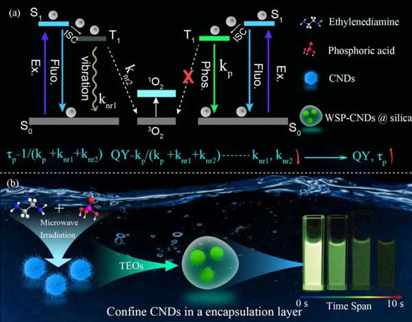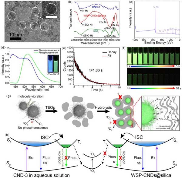 圖3: CDs@Silica復(fù)合材料的結(jié)構(gòu)和光學(xué)性能以及其在水溶液中磷光發(fā)射原理。