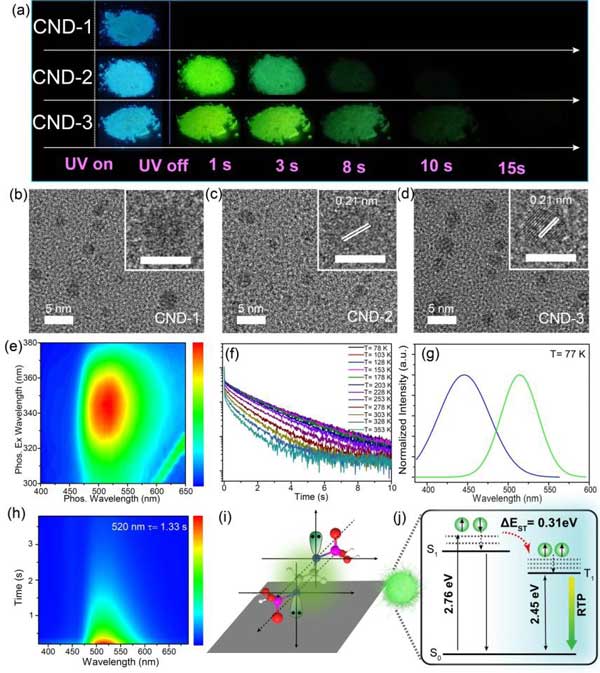 圖2: CDs的結(jié)構(gòu)和光學(xué)性能以及磷光發(fā)光機(jī)理。