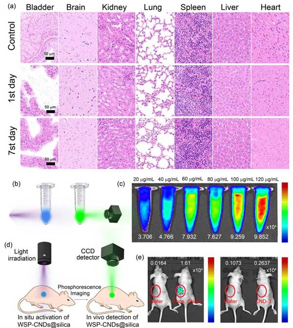 基于以上研究成果,團(tuán)隊(duì)計(jì)劃將其應(yīng)用于生物醫(yī)學(xué)標(biāo)記領(lǐng)域,有望推動(dòng)磷光納米粒子在生物醫(yī)學(xué)和臨床治療中的應(yīng)用,并拓展碳納米點(diǎn)在余輝生物成像中的應(yīng)用,據(jù)知這也是磷光碳點(diǎn)第一次被應(yīng)用于活體成像領(lǐng)域。