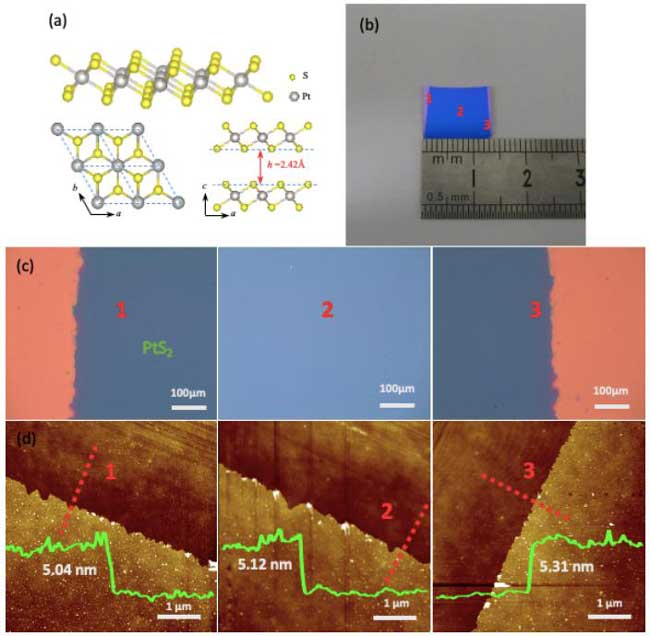 圖1 (a)PtS2的原子構(gòu)型 (b)大面積少層PtS2光學(xué)圖像 (c)少層PtS2光學(xué)顯微鏡圖 (d)少層PtS2上不同位置的AFM高度分布。