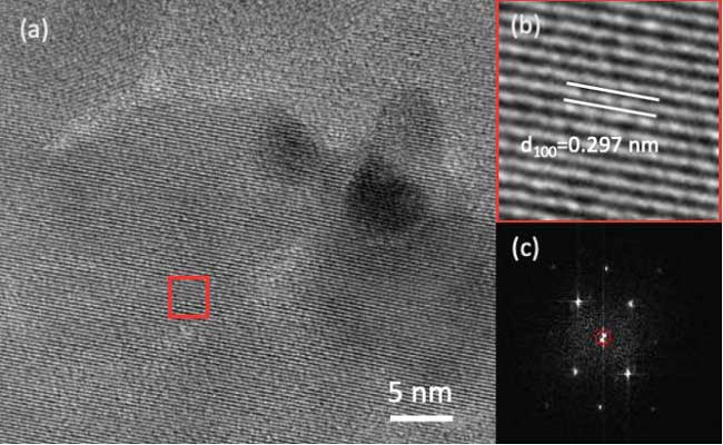 圖2 (a)剝離的的PtS2高分辨透射電子顯微鏡圖像 (b)晶格條紋圖 (c)對(duì)應(yīng)紅色方框的快速傅里葉變換衍射圖。