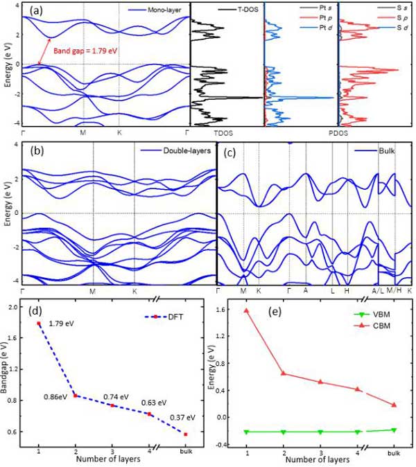 圖3 (a)單層PtS2的能帶和態(tài)密度 (b)雙層PtS2的能帶結(jié)構(gòu) (c)PtS2塊體材料的能帶結(jié)構(gòu) (d) 不同層數(shù)的PtS2的帶隙值變化圖 (e)不同層數(shù)PtS2的導(dǎo)帶和價(jià)帶變化