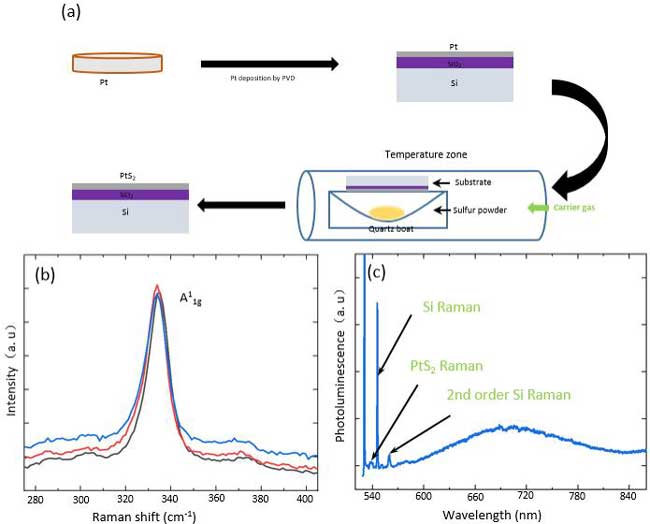 圖4 (a)大面積少層PtS2的制備示意圖 (b)樣品三個(gè)不同位置獲得的拉曼光譜 (c) PtS2的光致發(fā)光光譜