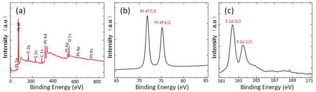圖5 (a)少層PtS2的X-射線光電子能譜(XPS) (b) Pt的XPS能譜 (c) S的XPS能譜