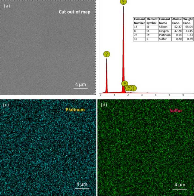 圖6 (a)少層PtS2掃描電鏡圖像 (b)少層PtS2元素含量 (c) Pt元素mapping圖 (d) S元素mapping圖