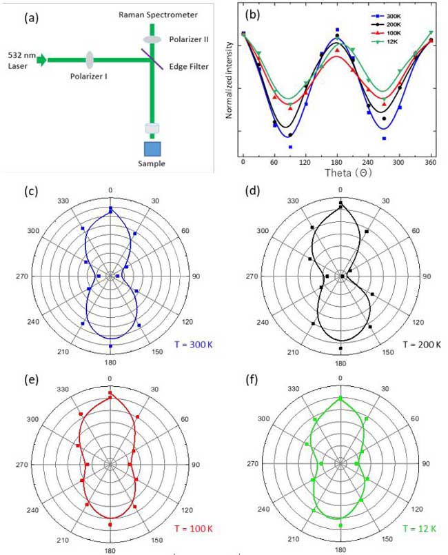圖7 少層PtS2的偏振拉曼測(cè)量 (a)角度分辨偏振拉曼光譜原理圖 (b)分別在溫度300K(藍(lán)線)、200K(黑線)、100K(紅線)、12K(綠線)不同偏振角度下拉曼振動(dòng)模式的強(qiáng)度變化(點(diǎn)是實(shí)驗(yàn)數(shù)據(jù),實(shí)線是對(duì)數(shù)據(jù)的擬合)(c - f)溫度為300 K (c)、200 K (d)、100 K (e)和12K (f)偏振拉曼振動(dòng)模式強(qiáng)度極性圖