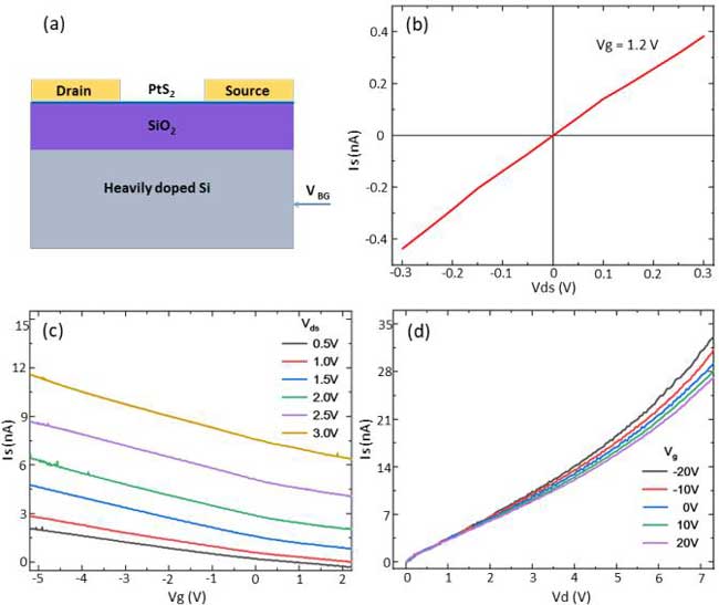 圖8 大面積少層PtS2的場(chǎng)效應(yīng)晶體管(Field effect transistor, FET)特性 (a) FET示意圖 (b) FET的Is - Vds特性 (c)不同漏源極電壓FET器件Id-Vbg轉(zhuǎn)移曲線 (d) FET的Is - Vds輸出曲線