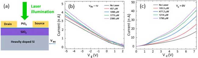 圖9 大面積少層PtS2的光電流特性 (a)光電器件橫截面圖 (b) PtS2光電器件在不同光功率下的電流- Vg曲線 (c) PtS2 光電器件在不同光功率下的電流- Vds曲線