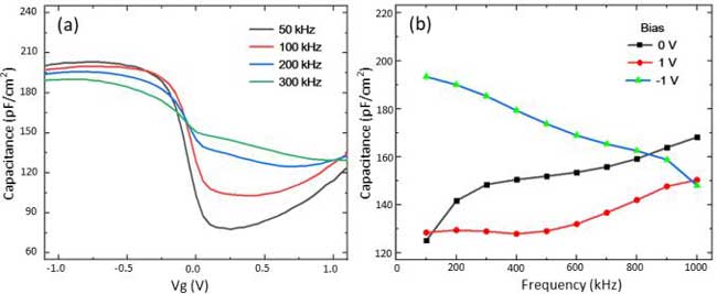 圖10 大面積少層PtS2的C-V性能 (a)不同探測(cè)頻率下PtS2的C-V特性 (b)在-1V、0V、1V不同偏壓下,電容隨頻率的變化圖