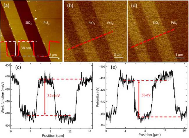 圖11 PtS2在SiO2/Si襯底上的KPFM圖像 (a) PtS2樣品的AFM高度圖 (b)基于開爾文探針力顯微鏡(Kelvin probe force microscope, KPFM )測(cè)量PtS2的功函數(shù)圖像 (c)PtS2的功函數(shù)展示 (d)基于開爾文探針力顯微鏡(Kelvin probe force microscope, KPFM )測(cè)量PtS2的表面電勢(shì)圖像 (e) PtS2的表面電勢(shì)展示