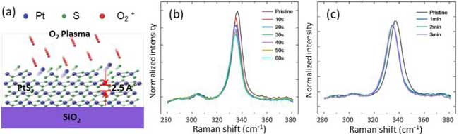 圖13 PtS2的拉曼光譜強(qiáng)度在氧等離子體處理前后的變化 (a) O2等離子體處理PtS2的示意圖(b)O2等離子體處理不同時(shí)間的拉曼光譜變化 (c)O2等離子體處理時(shí)間為分鐘數(shù)量級(jí)的拉曼光譜變化