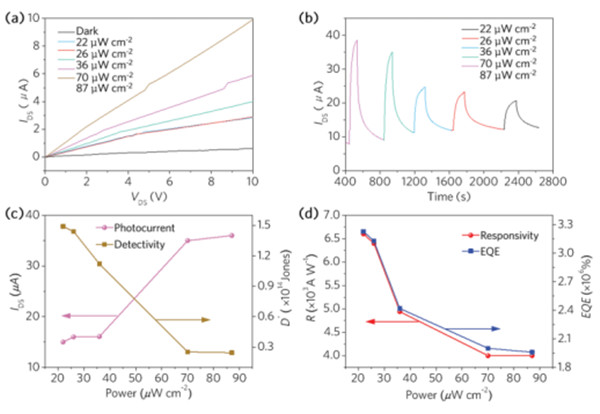 圖4.光強(qiáng)度對(duì)光電性能的影響。(a)在不同光強(qiáng)度下IDS-VDS特性。(b)在不同光強(qiáng)度下器件隨時(shí)間變化的光響應(yīng)。(c)光電流和探測(cè)率為光強(qiáng)度的函數(shù)。(d)響應(yīng)度和EQE與光強(qiáng)度的關(guān)系。