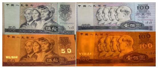 下圖為第四版人民幣在日光燈和紫外燈下的對(duì)比圖片。