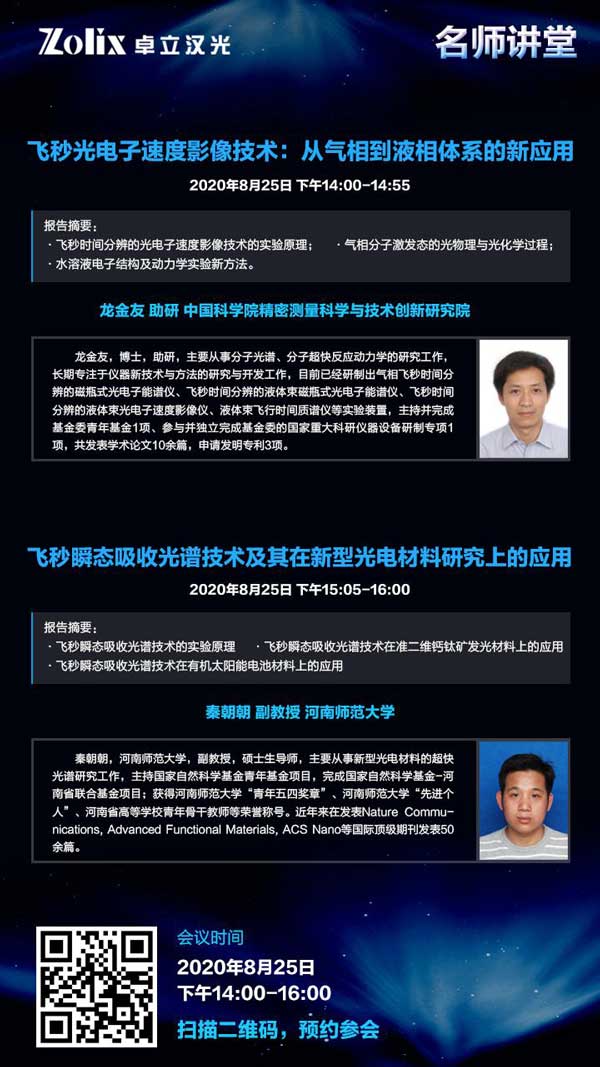 2020年8月25日下午14:00-16:00,卓立漢光將邀請(qǐng)兩位專家( 中國(guó)科學(xué)院精密測(cè)量科學(xué)與技術(shù)創(chuàng)新研究院龍金友老師與河南師范大學(xué)秦朝朝副教授),與大家在線上分享飛秒光電子速度影像技術(shù)&飛秒瞬態(tài)吸收光譜技術(shù)——新材料領(lǐng)域應(yīng)用