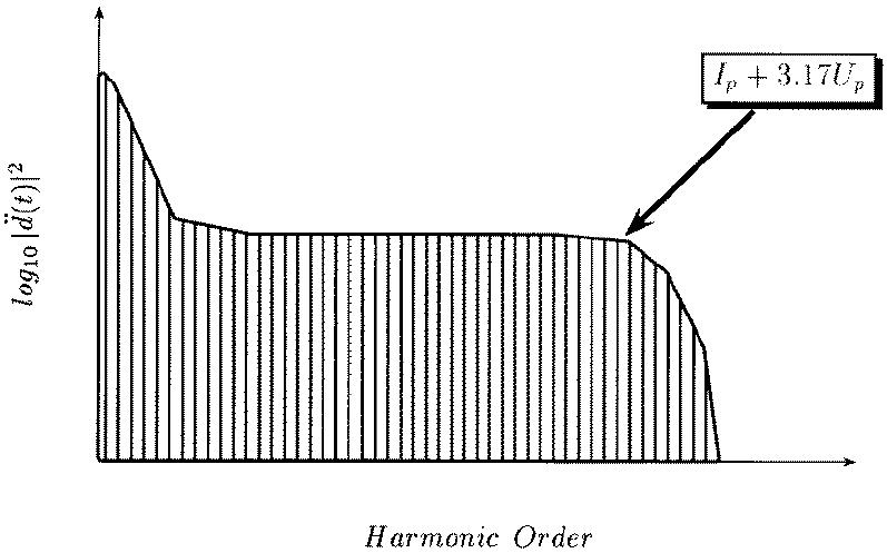 圖1、氣體高次諧波譜的簡(jiǎn)單示意圖,包含了氣體高次諧波譜的光譜形狀基本特征。在低級(jí)次處高次諧波強(qiáng)度快速下降,對(duì)應(yīng)于傳統(tǒng)的微擾非線性光學(xué)區(qū)域;隨后是一個(gè)強(qiáng)度變化相對(duì)比較平緩的平臺(tái)區(qū),在Ip+3.17Up附近高次諧波強(qiáng)度再次急劇下降,對(duì)應(yīng)于高次諧波截止區(qū)。