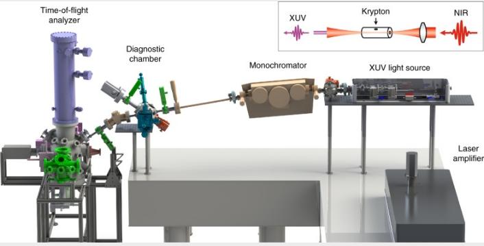 圖2、基于XUV的時(shí)間分辨ARPES裝置。插圖(右上)顯示了近紅外(NIR)光通過(guò)氪氣產(chǎn)生高次諧波(HHG)以產(chǎn)生極紫外(XUV)光的實(shí)驗(yàn)布局[Nature Communications, 06 Aug 2019, 10(1):3535]