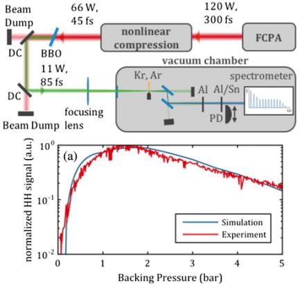 幾乎所有的氣體高次諧波實(shí)驗(yàn)所得到的諧波譜都表現(xiàn)出同一個(gè)特征:隨著諧波級(jí)次的增加,開始一些低次諧波效率單調(diào)下降,緊接著出現(xiàn)一個(gè)所謂的“平臺(tái)”;在平臺(tái)區(qū)內(nèi),諧波的強(qiáng)度隨諧波級(jí)次的增加下降得非常緩慢;在平臺(tái)區(qū)末端的某一級(jí)次諧波附近,諧波強(qiáng)度迅速下降,出現(xiàn)截止。這意味著一個(gè)非常重要的優(yōu)勢(shì),即它產(chǎn)生了從真空紫外到X射線的寬帶頻譜。目前,實(shí)驗(yàn)上獲得的*短高次諧波輻射波長(zhǎng)已經(jīng)達(dá)到<1 nm [Science, 2012, 336: 1287.]。通過(guò)中紅外激光脈沖與多價(jià)態(tài)離子相互作用甚至可以產(chǎn)生光子能量達(dá)到~5.2 keV的高光子能量的諧波輻射[Optica Vol. 9, No. 9,1003,September2022]。