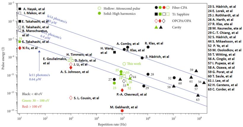 近些年,隨著高重頻高平均功率飛秒激光系統(tǒng)的發(fā)展,激光系統(tǒng)的平均功率可達(dá)到千瓦水平,產(chǎn)生的極紫外高次諧波光源可達(dá)到近毫瓦水平(圖3),進(jìn)一步拓展寬帶極紫外光源的應(yīng)用,使得高次諧波光源成為一種非常有應(yīng)用潛力的光源,不僅在原子分子和凝聚態(tài)物理等基礎(chǔ)科學(xué)領(lǐng)域,目前更是在往半導(dǎo)體檢測(cè)等應(yīng)用領(lǐng)域拓展。
