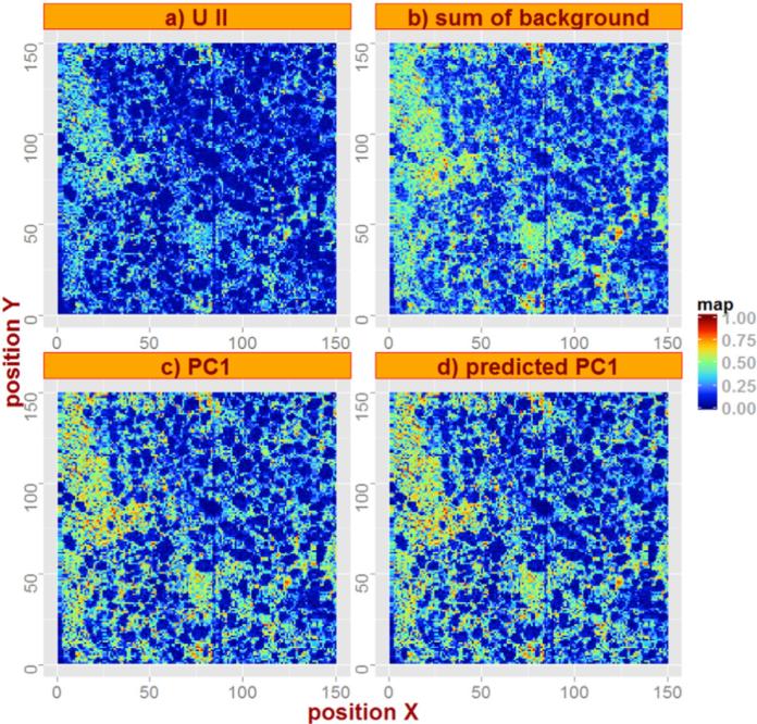 在天然鈾礦石中,鈾元素并不是均勻分布的。鈾元素空間分布特性反應(yīng)了成礦環(huán)境信息,對(duì)探索鈾礦的形成和演化過(guò)程至關(guān)重要。在單點(diǎn)檢測(cè)的基礎(chǔ)上,研究人員開(kāi)始采用LIPS技術(shù)對(duì)鈾礦石中的鈾元素分布進(jìn)行分析。捷克布爾諾理工大學(xué)的J. Klus等采用正交雙脈沖LIPS對(duì)鈾礦石中的鈾元素進(jìn)行檢測(cè),在此基礎(chǔ)上對(duì)鈾元素的含量分布進(jìn)行分析,獲得了鈾元素的二維分布圖;如圖5所示,鈾元素的二維分布的空間分辨率達(dá)到100 mm。捷克馬薩里克大學(xué)M. Hola等[12]將LIPS技術(shù)與激光燒蝕電感耦合等離子體質(zhì)譜(Laser Ablation-Inductively Coupled Plasma Mass Spectrometry, LA-ICP-MS)技術(shù)相結(jié)合對(duì)鈾礦石中的鈾(U)、鐵(Fe)、鉛(Pb)、鈣(Ca)等多種元素進(jìn)行綜合分析,獲得了元素二維空間分布圖;其中LIPS被用于元素分布的整體快速成像,可以在20分鐘內(nèi)獲取4.0´23.2 mm范圍內(nèi),51´290個(gè)點(diǎn)位的元素分布圖像,空間分辨率為80 mm。LIPS技術(shù)具有掃描速度快、空間分辨率高的獨(dú)特優(yōu)勢(shì),但掃描過(guò)程受基體效應(yīng)影響較大,在檢測(cè)非均勻樣品時(shí),樣品密度、硬度、元素含量的變化均會(huì)對(duì)檢測(cè)結(jié)果造成干擾。因此,根據(jù)檢測(cè)對(duì)象物理、化學(xué)特性的變化對(duì)特征譜線強(qiáng)度進(jìn)行補(bǔ)償,突破不同基體下鈾礦石元素分布的精準(zhǔn)定量,將是LIPS技術(shù)的研究重點(diǎn)。