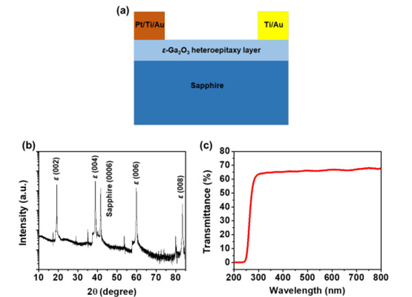 日盲光電探測(cè)器對(duì)波長(zhǎng)在220-280 nm范圍內(nèi)的光敏感,在軍事和商業(yè)領(lǐng)域都有著廣泛的應(yīng)用,例如光學(xué)追蹤、光通信和成像。得益于優(yōu)越的材料和電學(xué)特性,包括良好的熱學(xué)和化學(xué)穩(wěn)定性、優(yōu)異的抗輻照性能以及直接對(duì)應(yīng)日盲區(qū)域的光探測(cè)波長(zhǎng),寬禁帶半導(dǎo)體材料具備更顯著的優(yōu)勢(shì)。在過去的幾年里,由于Ga2O3相關(guān)材料的優(yōu)異的抗輻照特性、良好的熱穩(wěn)定性以及4.7-5.3 eV直接對(duì)應(yīng)于日盲波段的超寬禁帶寬度,已經(jīng)引起了廣泛的關(guān)注。目前,幾乎所有關(guān)于Ga2O3 PDs的研究都是基于a-或β-Ga2O3材料,然而,探測(cè)器的光電性能不盡如人意,并且增益機(jī)制尚未分析確定。因此,ε-Ga2O3的材料和光電特性有待進(jìn)一步研究。