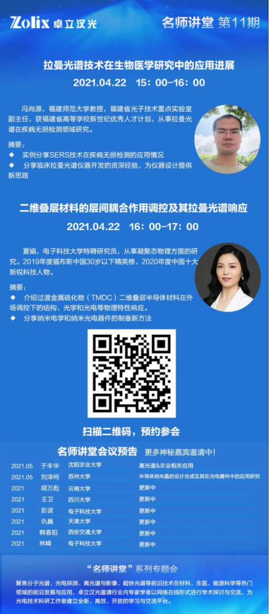 2021年4月22日 15:00-17:00,卓立漢光邀請(qǐng)兩位專家:福建師范大學(xué)教授馮尚源老師與電子科技大學(xué)特聘研究員夏娟老師為大家做分享,您將有如下課程收獲: