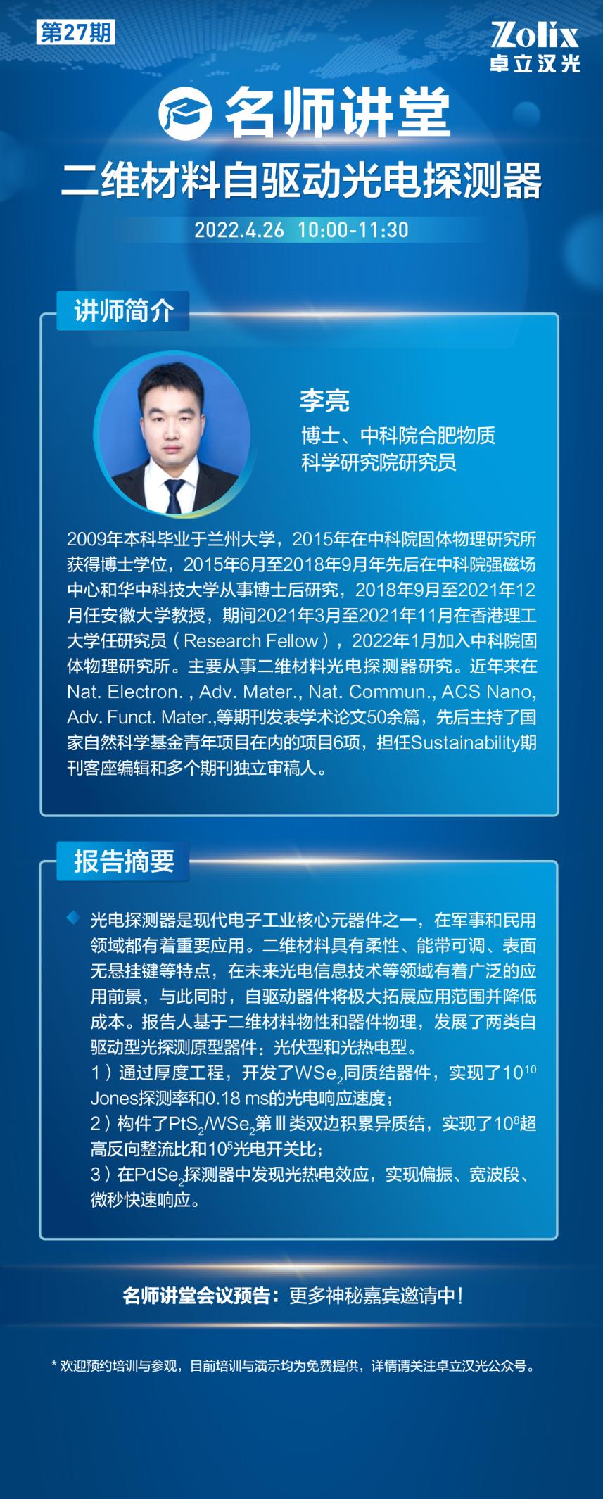 講師簡(jiǎn)介:李亮,中科院合肥物質(zhì)科學(xué)研究院研究員。2009年本科畢業(yè)于蘭州大學(xué),2015年在中科院固體物理研究所獲得博士學(xué)位,2015年6月至2018年9月年先后在中科院強(qiáng)磁場(chǎng)中心和華中科技大學(xué)從事博士后研究,2018年9月至2021年12月任安徽大學(xué)教授,期間2021年3月至2021年11月在香港理工大學(xué)任研究員(Research Fellow),2022年1月加入中科院固體物理研究所。主要從事二維材料光電探測(cè)器研究。近年來在Nat. Electron. , Adv. Mater., Nat. Commun., ACS Nano, Adv. Funct. Mater.,等期刊發(fā)表學(xué)術(shù)論文50余篇,先后主持了國家自然科學(xué)基金青年項(xiàng)目在內(nèi)的項(xiàng)目6項(xiàng),擔(dān)任Sustainability期刊客座編輯和多個(gè)期刊獨(dú)立審稿人。