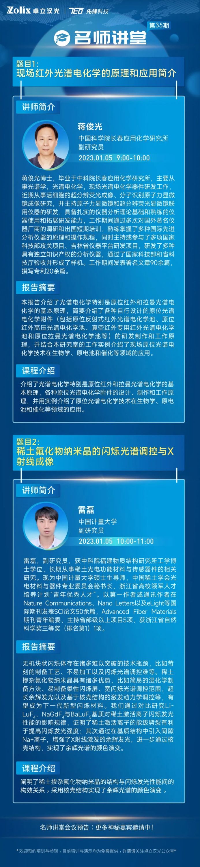 本期卓立漢光隆重邀請到了中國科學(xué)院長春應(yīng)用化學(xué)研究所,副研究員—蔣俊光老師和中國計量大學(xué),副研究員—雷磊老師,兩位老師將與大家分享自己科研領(lǐng)域的經(jīng)驗和心得體會。希望本次講座能夠為您的科學(xué)研究帶來靈感與助力,推動研究的進展,精彩不容錯過,掃描下方的二維碼,趕快報名開啟學(xué)習(xí)之旅吧~第35期名師講堂