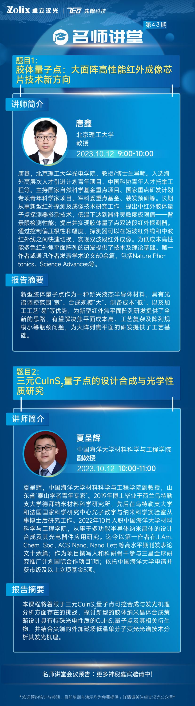 為了與大家共同感受諾貝爾化學(xué)獎-量子點(diǎn)的科技魅力,本期卓立漢光特別隆重邀請到了北京理工大學(xué)—唐鑫教授和中國海洋大學(xué)材料科學(xué)與工程學(xué)院—夏呈輝副教授,與大家分享在膠體量子點(diǎn)研究領(lǐng)域的經(jīng)驗(yàn)和心得體會,希望本次講座能夠?yàn)槟目茖W(xué)研究帶來靈感與助力,推動研究的進(jìn)展,精彩不容錯過,趕快報(bào)名開啟學(xué)習(xí)之旅吧~