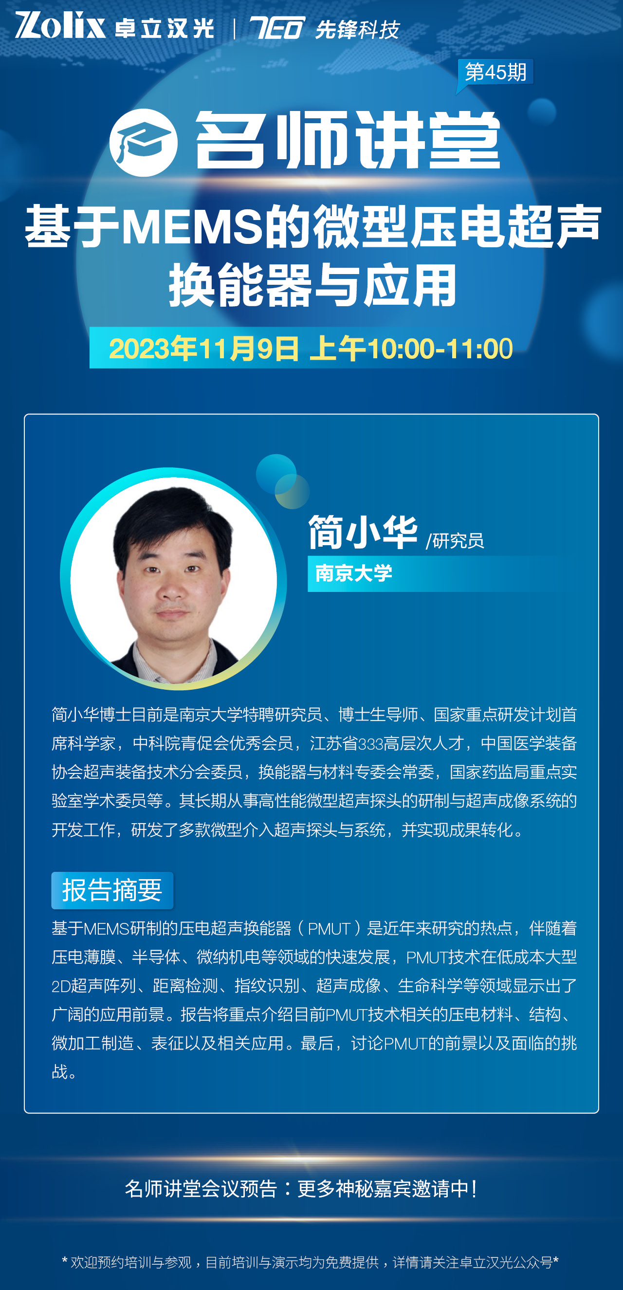 本期隆重邀請(qǐng)到了南京大學(xué)特聘研究員—簡(jiǎn)小華研究員,與大家分享自己科研領(lǐng)域的經(jīng)驗(yàn)和心得體會(huì),他帶來(lái)的講座題目是《基于MEMS的微型壓電超聲換能器與應(yīng)用》,希望本次講座能夠?yàn)槟目茖W(xué)研究帶來(lái)靈感與助力,推動(dòng)研究的進(jìn)展,精彩不容錯(cuò)過(guò),趕快報(bào)名開(kāi)啟學(xué)習(xí)之旅吧~